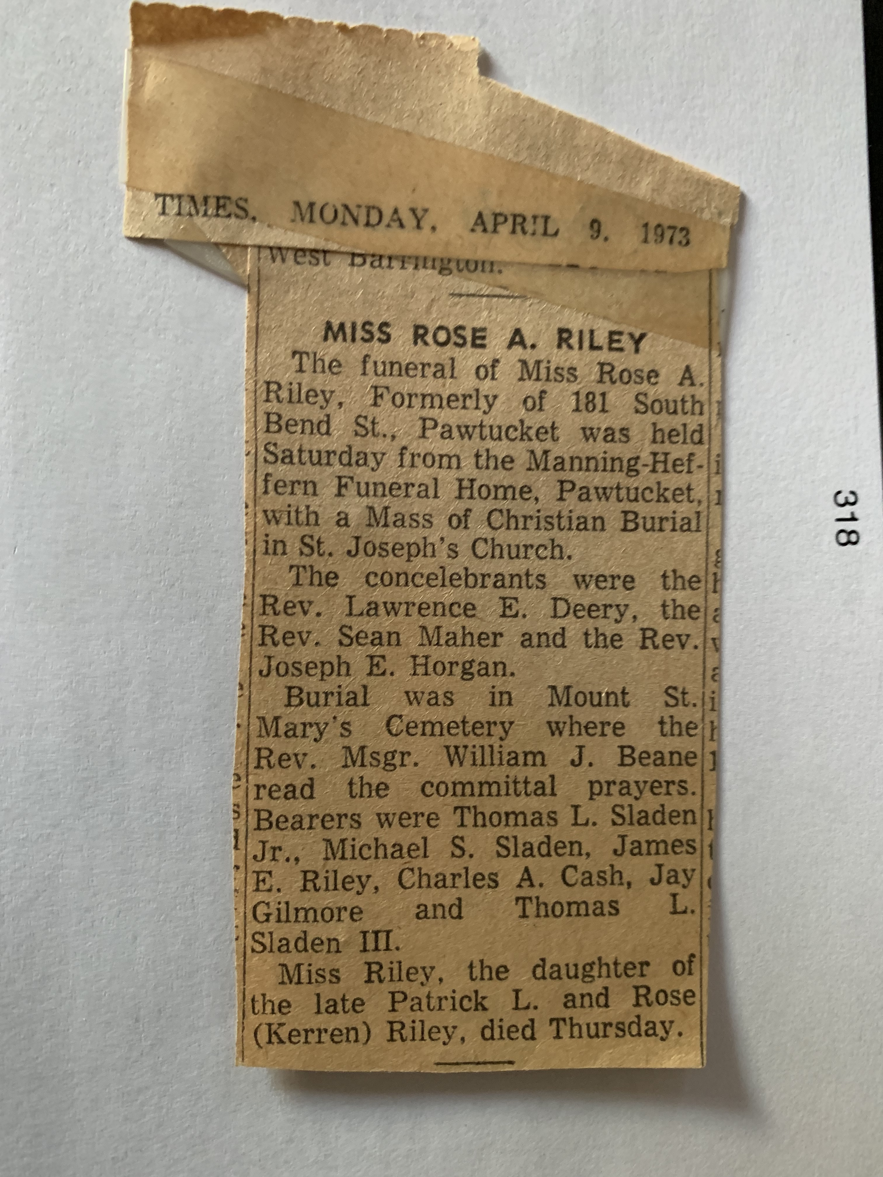 His sister, Rose Riley was born on June 7, 1887 in Pawtucket, RI. At the time of her birth, her father (Patrick) was 52 and her mother, Rose was 42. Rose never married and lived her life in Pawtucket. She was 85 years old at the time of her death on April 5, 1973 and was living at 181 South Bend Street. See the attached item.