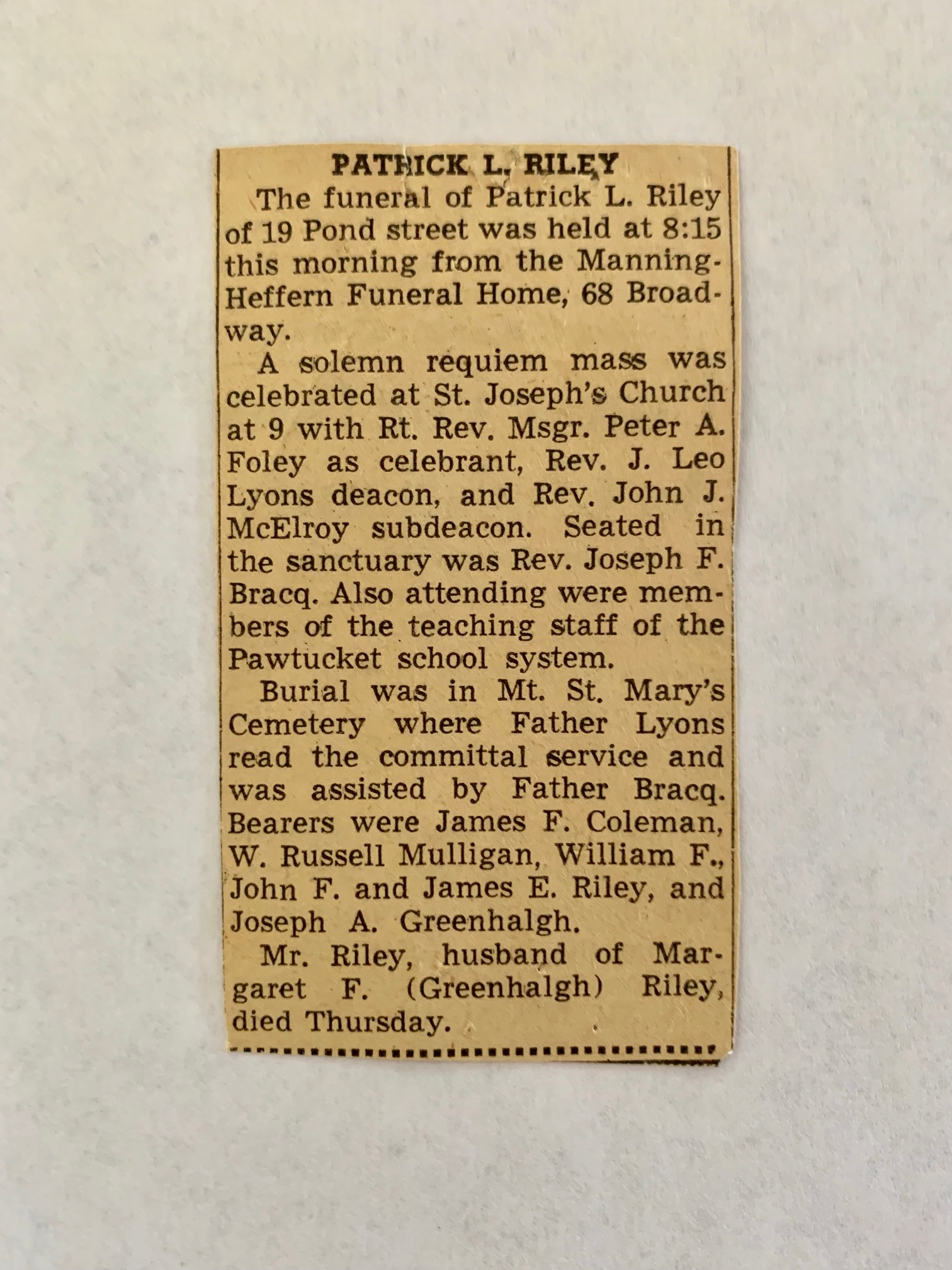 Patrick Leo Riley was born on June 7, 1875 in Pawtucket, RI, his father, Patrick, was 40 and his mother, Rose, was 32. He married Marguetta E. Greenhalgh in 1898. They had eight children in 16 years, Patrick Leo died on April 7, 1955 in Pawtucket at the age of 79.