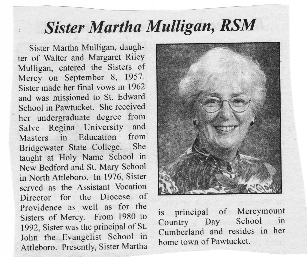 Sister Martha Mulligan, RSM (Religious Sister of Mercy) has a birthday today. Sister was born in Pawtucket, and grew up in the neighborhood near Memorial Hospital.