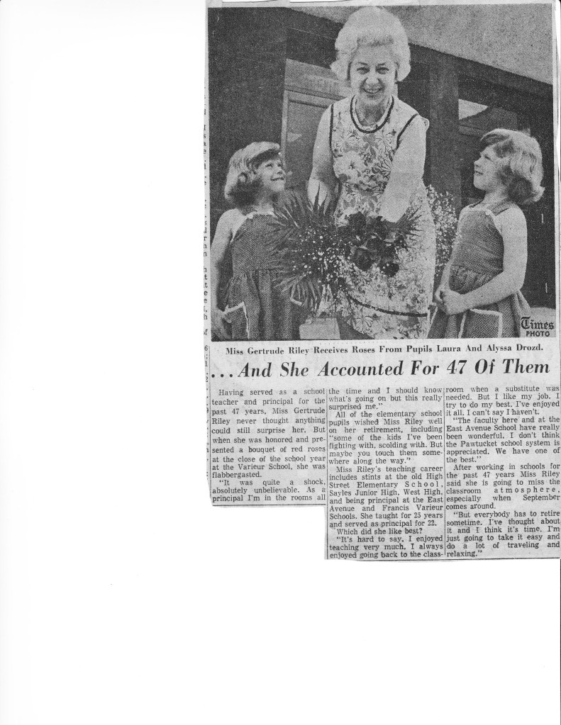 Gertrude C. Riley was born on this day in 1904, and passed away on October 22, 1999. Known to her nieces and nephews as “Aunt Gertie,” she had a distinguished 47 year career as an educator in the Pawtucket School Department. Aunt Gertie retired after serving the last 22 years as an elementary school principal.