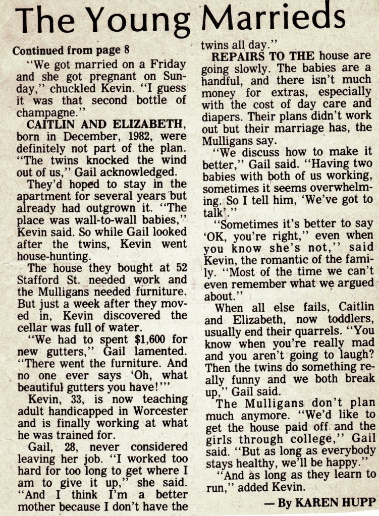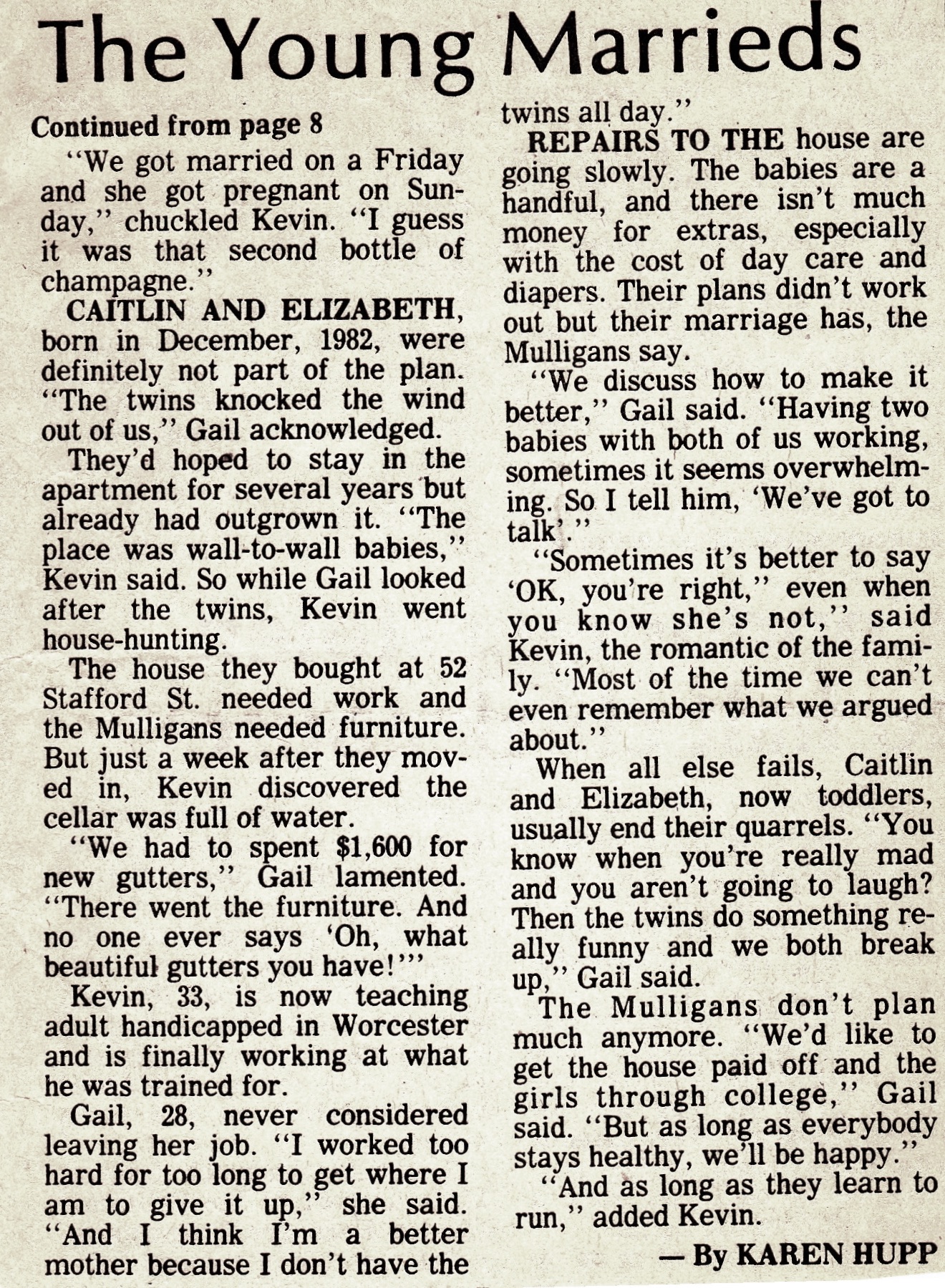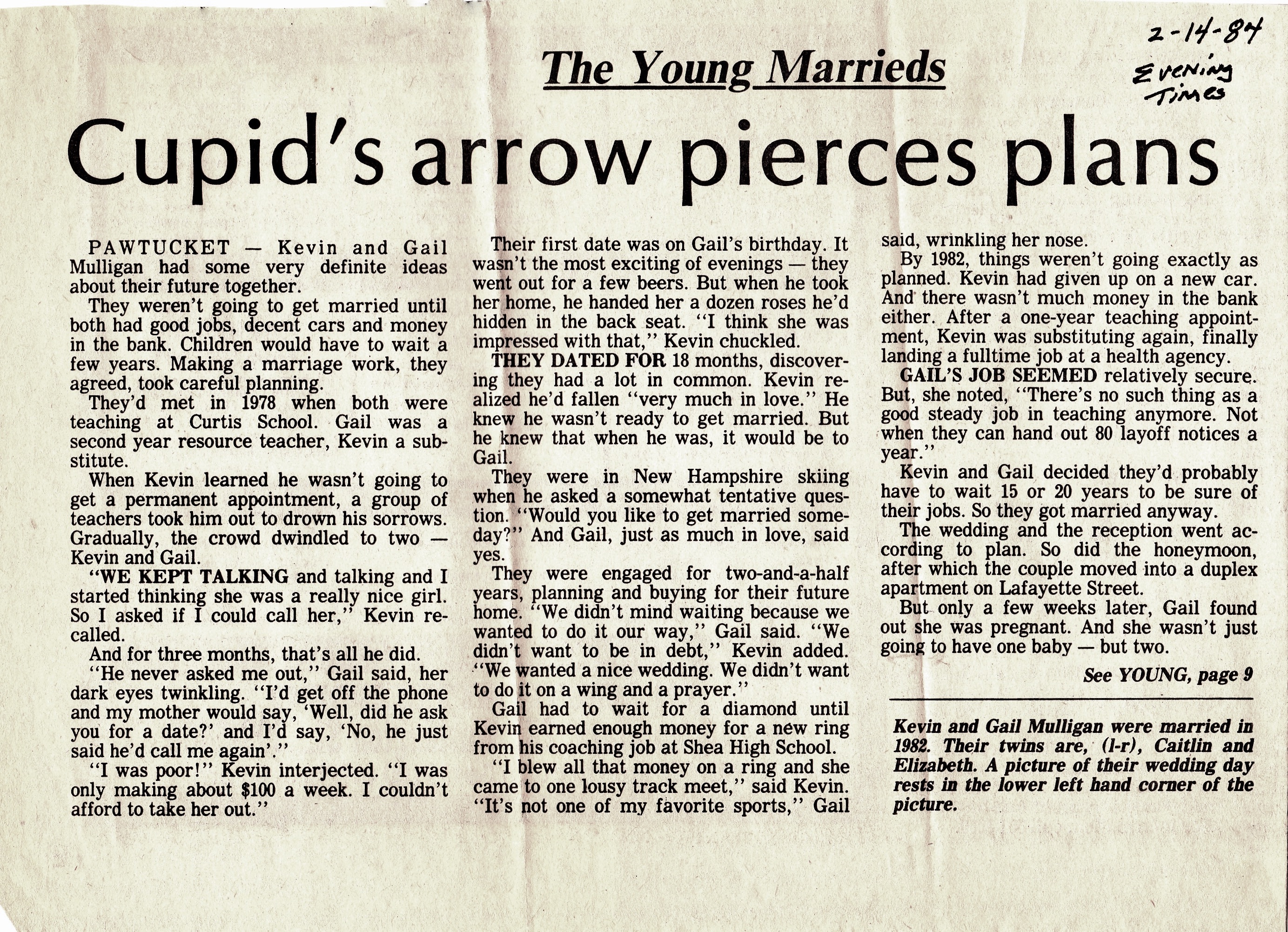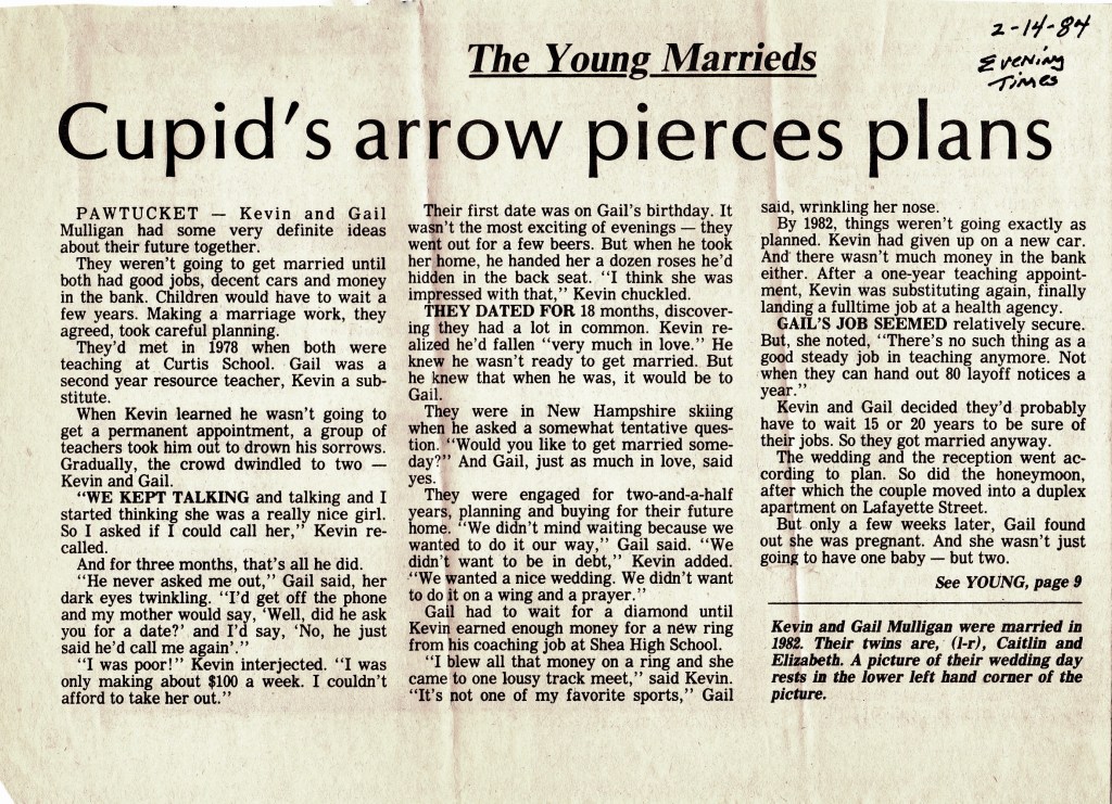 Here is an article from the Pawtucket Evening Times that was published on Valentine’s Day back in 1984. It wouldn’t surprise me to find out that Kevin had arranged for this story to be in the paper on February 14th in lieu flowers and chocolates!