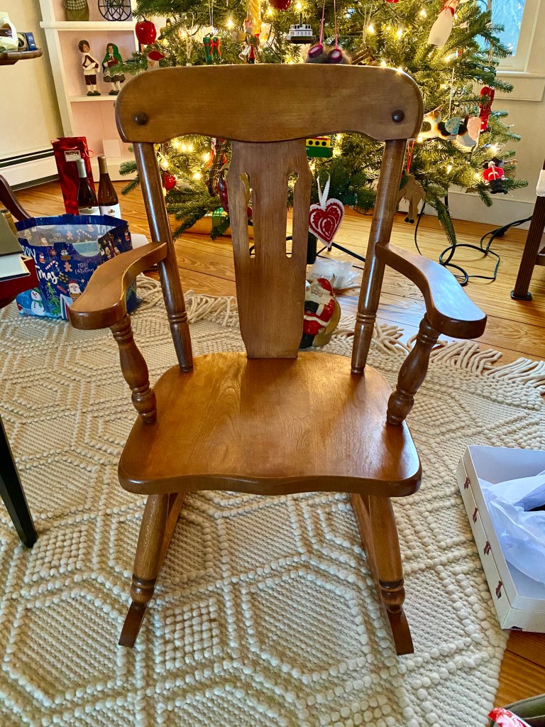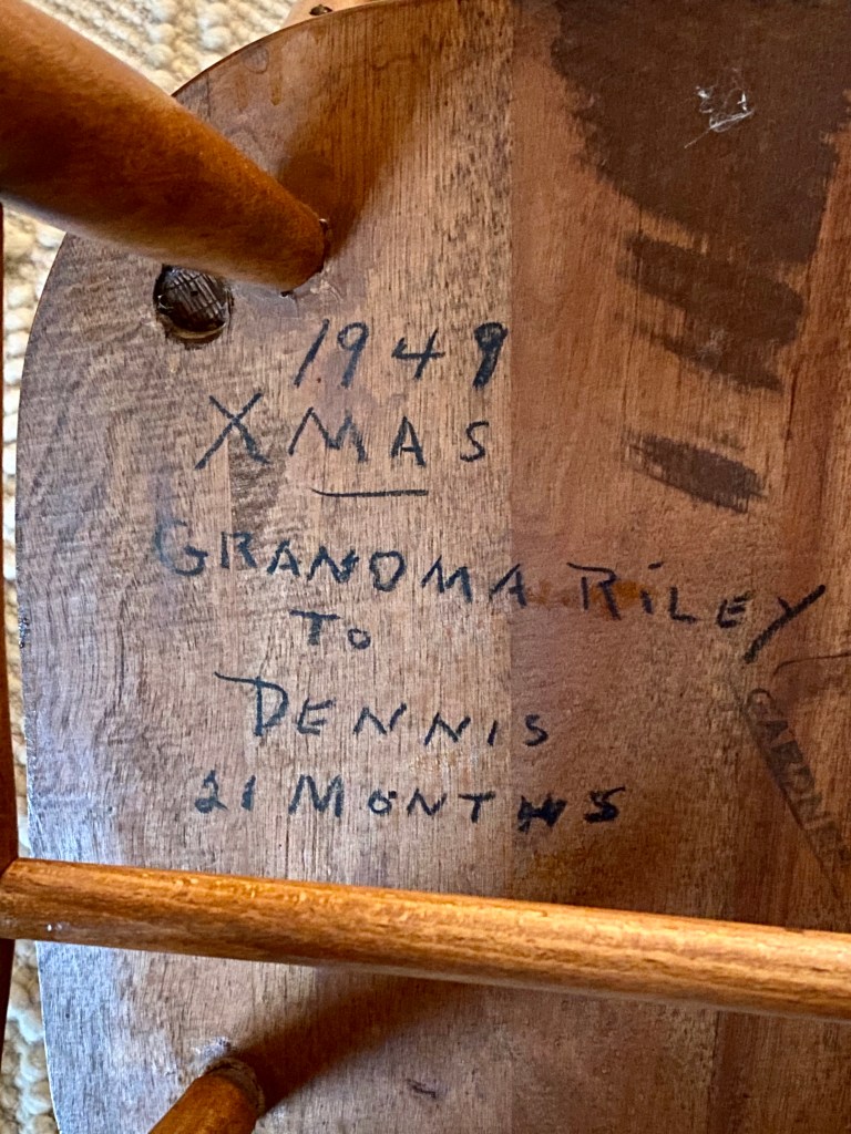 The gift that I have kept the longest is this maple rocking chair. It was gifted to me by Grandma Riley (1876-1962) on Christmas Day in 1949. My mother wrote the information on the bottom of the chair.