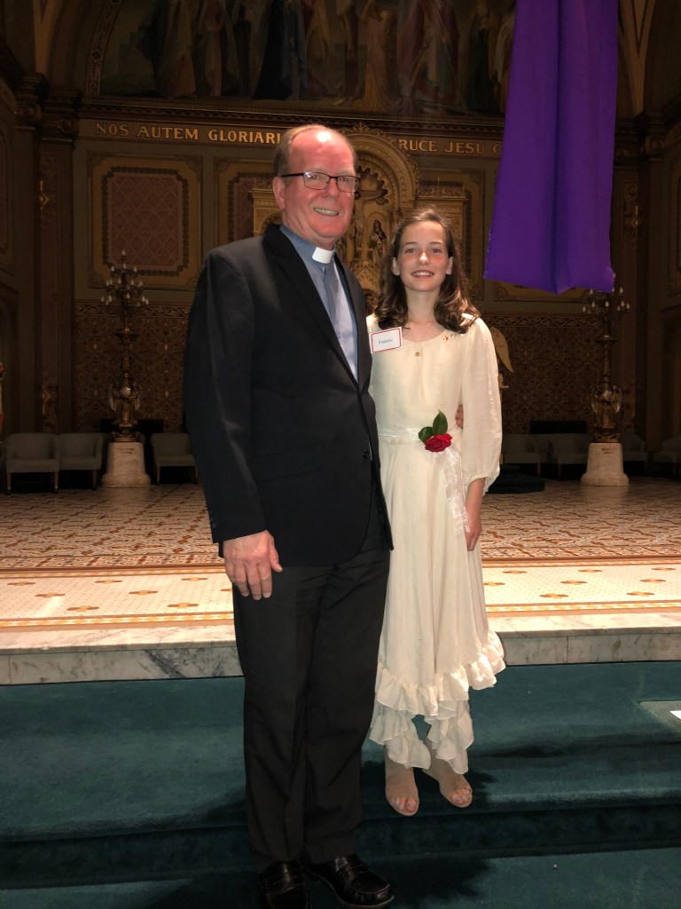 Now, some of this blog’s more observant readers may have said, “Well, he made another mistake. He used the masculine form to spell Maeve’s middle name.” No, no, no, it is not a mistake at all! You see, Maeve has a deep love of animals and a strong spiritual connection to their patron, Saint Francis. When it was time for Maeve’s confirmation, it was Saint Francis’s name she chose. A beautiful reflection of Maeve’s spirituality and personal credo.